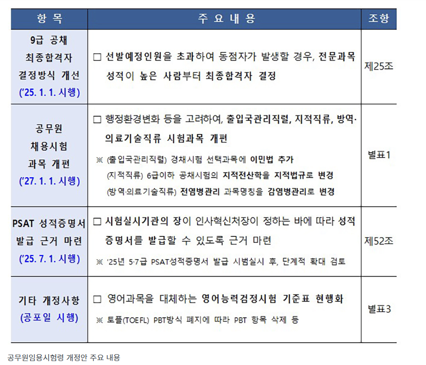 또한 공직적격성평가(PSAT) 성적증명서 발급이 가능해지고, 오는 2027년부터는 일부 직류의 시험과목도 변경된다.